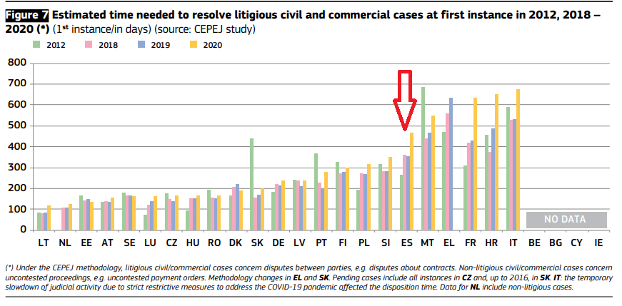 Los datos publicados en el informe señalan que la tasa de resolución de los órganos jurisdiccionales es algo inferior al 100%, es decir no es capaz de hacer frente a lo que reciben. Además, los Tribunales civiles tienen un stock de litigios que aún deben tramitarse superior a la mayorÃa de los Estados Miembros, que ha aumentado respecto al 2019.